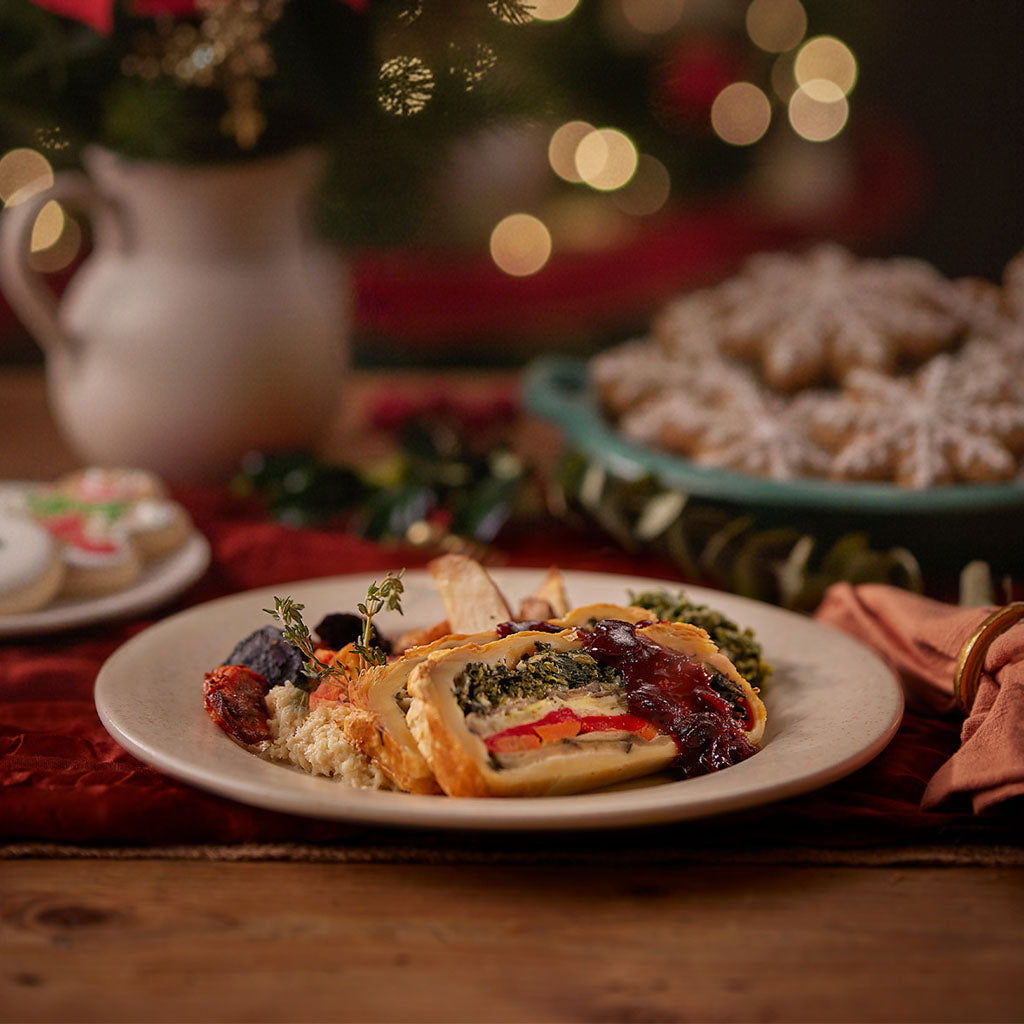 Vegetable Wellington, Mustard Apricot Glaze, Mashed Potatoes, Cream Spinach, Heirloom Carrots & Brussels Sprouts, Cream Corn